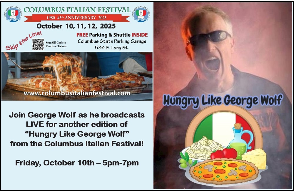 Join George Wolf Friday, October 10th from 5pm-7pm with another edition of “HUNGRY LIKE GEORGE WOLF”! He’ll be sharing with you all the BEST eats that The Columbus Italian Festival has to offer!