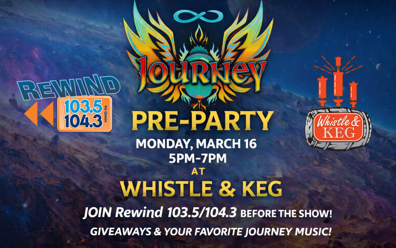 If you’re heading to the Journey show on Monday, March 16, start your night early and join George Wolf for the Rewind 103.5/104.3 Journey Pre-Party at Whistle & Keg, right next door to Nationwide Arena!
