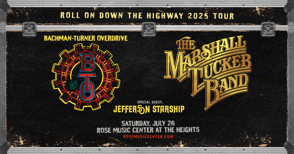 HUBER HEIGHTS, OH (2/24/2025) – Today, Bachman-Turner Overdrive, the legendary rock n’ roll band behind worldwide hits such as “Takin’ Care Of Business” and “You Ain’t Seen Nothin’ Yet”, announced a new run of US tour dates dubbed, Roll On Down The Highway 2025 Tour. Co-headlining with southern rock pioneers The Marshall Tucker Band, with the 70s/80s hitmakers Jefferson Starship as the special guest, the tour will stop in Huber Heights, OH for a performance at Rose Music Center at The Heights on Saturday, July 26.